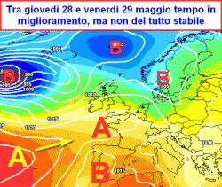 RIASSUMENDO: Sabato 23 e domenica 24 maggio tempo ancora instabile specie al centro e sul meridione peninsulare, con rischio di rovesci ed episodi temporaleschi. Situazione migliore al nord-ovest, sulle Isole e all’estremo sud, temperature abbastanza fresche. Lunedì 25 maggio migliora al centro-sud, nuovi temporali al nord entro sera. Tra martedì 26 e mercoledì 27 maggio instabile su tutta l’Italia con fenomeni in movimento dal centro-nord verso il meridione, accompagnati da un nuovo calo delle temperature e da un rinforzo della ventilazione. Giovedì 28 e venerdì 29 maggio tempo abbastanza buono a parte gli ultimi disturbi al meridione nella giornata di giovedì, in via di attenuazione.