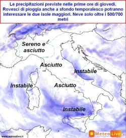 Giovedì 10 instabilità anche a sfondo temporalesco sul meridione. Rovesci di neve possibili oltre a 500/700 metri di quota. qualche precipitazione anche su medio Adriatico. Sereno al nord e sulle centrali tirreniche. Freddo e ventoso.