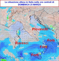 Domenica 25 marzo: maltempo al sud e sulla Sicilia con piogge intense e temporali. Rovesci sulla Sardegna orientale e il medio Adriatico con neve sui 900-1000 metri, per il resto asciutto, un po’ freddo al nord e al centro per correnti da est.