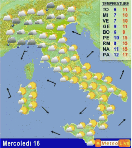 Mercoledi 16 dicembre: qualche pioggia al nord, sulla Toscana e brevi nevicate sulle Alpi sopra i 1300-1500 metri. Altrove un po’ di nubi alte senza fenomeni. Clima non freddo.