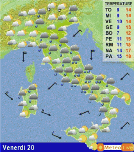 Venerdi 20 novembre: passaggio instabile sulla Penisola, molto veloce al nord dove le nebbie si dissiperanno; più intenso al centro e al sud con piogge e rovesci sparsi specie nelle aree interne. Qualche nevicata sopra i 1000 metri sulle Alpi, 1200-1300 metri sul nord Appennino in un contesto più freddo e ventoso.