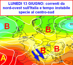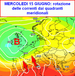 Mercoledì 15 giugno (terza mappa), cambierà di nuovo tutto: se ne andranno le correnti fresche da nord-ovest e subentrerà aria caldo-umida dai quadranti meridionali (frecce rosse).