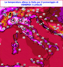La cartina visibile a lato risulta sufficientemente esplicativa per identificare il caldo che colpirà gran parte del nostro Paese, segnatamente il nord, il medio/alto Tirreno e le Isole. Valori attorno a 35-36° non saranno utopia su queste regioni, ma il danno più grosso verrà probabilmente inferto ai ghiacciai alpini.