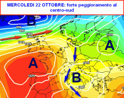 La cartina che vedete poco sopra inquadra la situazione sinottica attesa per le ore centrali di mercoledì 22 ottobre. L’incontro/scontro di correnti fresche in ingresso da nord con le calde acque del Mare Nostrum darà vita a temporali anche di forte intensità che colpirebbero prima il centro, poi il meridione e la Sicilia.