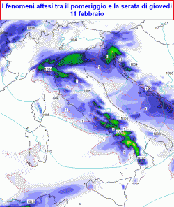 giovedì 11 febbraio: al nord dapprima bello e un po’ freddo, poi nuvolaglia in arrivo da ovest e la sera qualche precipitazione tra Liguria, bassa padana, Emilia-Romagna con neve oltre i 900-1000m in Appennino, al centro peggioramento a partire dalla Sardegna in estensione a tutto il versante tirrenico con piogge e rovesci sparsi, neve oltre i 1300m. Sui versanti adriatici parzialmente nuvoloso e solo lungo i crinali appenninici qualche precipitazione. Temperature in ulteriore calo al nord, stazionarie al centro-sud.