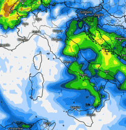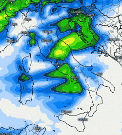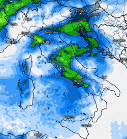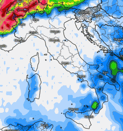 Venerdi residue precipitazioni coinvolgeranno ancora il meridione e in Sardegna in mattinata, per poi attenuarsi, mentre sulle Alpi di confine insisteranno ancora le precipitazioni, anche di tipo nevoso, come vediamo da questa mappa relativa alla sommatoria dei fenomeni previsti per venerdi 15 marzo secondo il modello americano:
