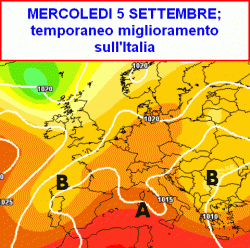 Ne seguirà una temporanea fase più stabile e relativamente calda sull’Italia che interverrà soprattutto nella giornata di mercoledi 5 settembre (prima mappa).