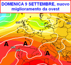 A seguire, tra domenica 9 e lunedi 10 settembre, l’alta pressione proverà a rimontare da ovest mettendo gran parte d’Italia sotto il sole e il cielo sereno (terza mappa).