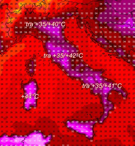 Una primissima stima delle temperature MASSIME previste al suolo dal modello americano per giovedì 12 agosto. Valori davvero infernali: