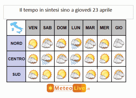 mercoledì 22 e giovedì 23 aprile: irruzione fredda da nord-est con nubi al nord-ovest, sulla Romagna, il basso Veneto e il medio Adriatico con locali piovaschi non esclusi, abbastanza soleggiato altrove ma ventoso ovunque e più freddo, specie sul Triveneto.