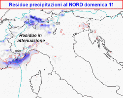 Domenica 11 insistono residue precipitazioni al nord-ovest, anche a carattere di rovescio sulla Liguria. Residua instabilità sulla Sicilia. Condizioni meteo più soleggiate altrove. Molto mite.