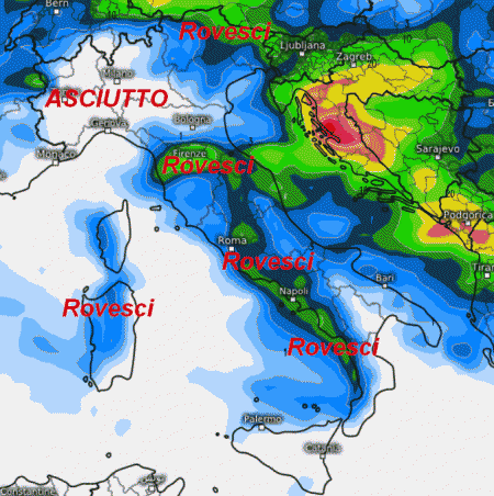 La distorsione delle correnti operata dalla rimonta anticiclonica sul bacino occidentale del Mediterraneo imporrà un passaggio da nord-ovest; di conseguenza gran parte delle regioni settentrionali verrà saltata da questa modesta perturbazione, a scapito dell’estremo nord-est e del centro-sud che avranno invece alcuni rovesci.