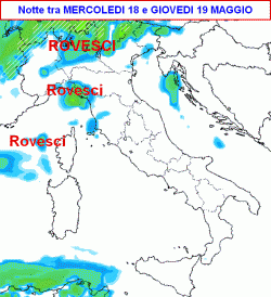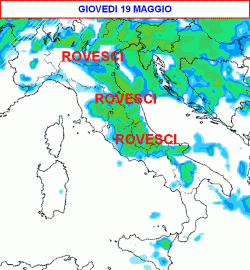 Nella giornata di giovedì 19 maggio (terza mappa) le precipitazioni potrebbero impegnare gran parte d’Italia, specie le zone interne dell’Italia centrale, il nord-est e il versante adriatico.