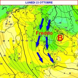 Tra lunedì 23 e martedì 24 ottobre (seconda mappa), la formazione di una profonda depressione più ad est farà insorgere una ventilazione settentrionale piuttosto fredda in Italia.