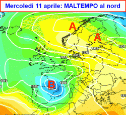 Tra mercoledi 11 e giovedì 12 aprile condizioni di maltempo al nord (specie al nord-ovest) con piogge anche intense e nevicate sopra i 900-1200 metri. Rovesci anche al nord-est, sulla Toscana, l’Umbria, l’alto Lazio e la Sardegna settentrionale; sul resto d’Italia nubi sparse e tempo asciutto fino a sera.