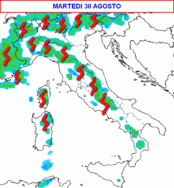 Breve sfuriata temporalesca sull'Italia tra martedì 30 e mercoledì 31 agosto, seguita da un ritorno dell'alta pressione. Successivamente un veloce guasto potrebbe interessare il nord-est e il versante adriatico.