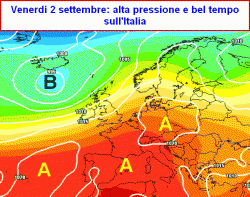 Venerdì 2 settembre (seconda mappa) l’anticiclone avrà ripreso pienamente possesso di tutta l’Italia e del bacino centro-occidentale del Mediterraneo, assicurando il bel tempo e il caldo praticamente ovunque.