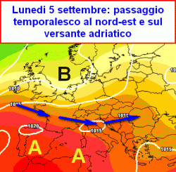 L’elaborato mostra qualche temporale in transito tra il nord-est e il versante adriatico nella giornata di lunedì 5 settembre, ma senza velleità di cambiamento.
