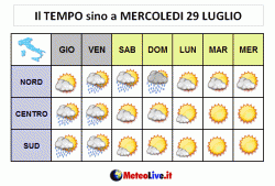 sabato 25 luglio: al nord tempo ancora inaffidabile con nuvolosità variabile e rischio di rovesci o brevi temporali, segnatamente a ridosso dei rilievi e sulle zone pianeggianti limitrofe, isolati temporali anche sulla costa ligure. Al centro isolati temporali in Appennino, per il resto sole e caldo, al sud soleggiato e molto caldo.
