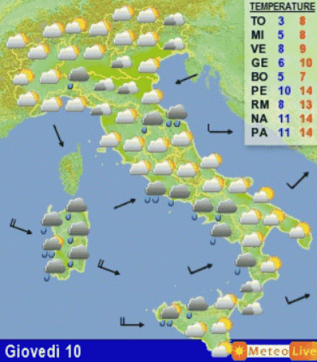 RIASSUMENDO: giovedi 10 dicembre avremo piogge in Sardegna, sul basso Tirreno e il nord della Sicilia, fenomeni assenti sul resto d’Italia anche se il cielo non sarà del tutto sereno.