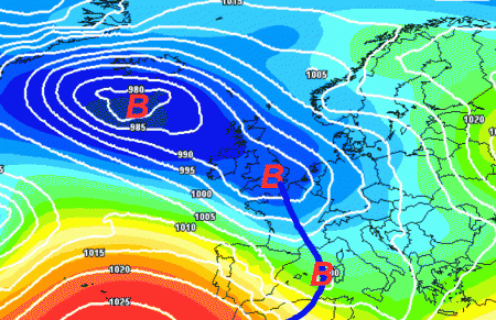 Tuttavia, tra venerdi e sabato, una nuova moderata perturbazione farà il suo ingresso da nord-ovest sul Mediterraneo; la vediamo schematizzata nella mappa valida per la notte tra venerdi 11 e sabato 12 dicembre: