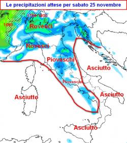 Sabato 25 novembre peggiora al nord e sull’alto Tirreno con piogge, neve sulle Alpi sopra i 1600-1800 metri, per il resto nessun cambiamento.