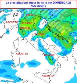 La medesima perturbazione nel suo incedere verso levante darà luogo ad una depressione con centro sull’Emilia Romagna nella giornata di domenica 26 novembre (seconda mappa).