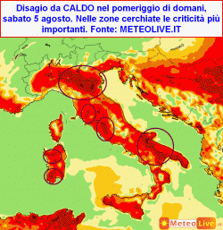 Sabato 5: note d’instabilità lungo la fascia alpina senza alcun coinvolgimento delle zone pianeggianti adiacenti. Ancora caldo assai intenso al centro ed al sud, con valori termici superiori a +40°C. Ventilazione debole.