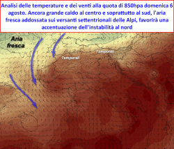 Ad esser più precisi, i primi intensi temporali su questi settori potranno verificarsi già tra il pomeriggio e la serata di domenica 6 agosto; in questa sede vi saranno "spifferi" d’aria più fresca che, traboccando dalle valli alpine, potranno dar luogo ai primi intensi temporali nelle aree di alta pianura.