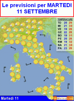 Martedi 11 e mercoledi 12 settembre soleggiato e stabile ovunque con clima caldo, eventuali addensamenti avranno carattere temporaneo e non saranno associati a nessuna precipitazione.