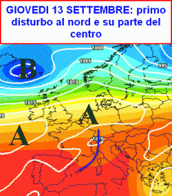Un primo disturbo, in verità poco incisivo, al dominio dell’alta pressione interverrà tra giovedì 13 e venerdì 14 settembre, segnatamente al nord e al centro.
