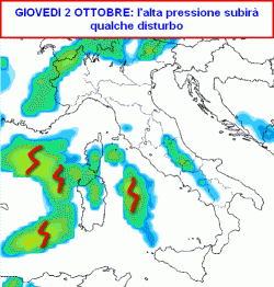 Mercoledì 1 ottobre qualche precipitazione (occasionalmente temporalesca) potrebbe farsi strada sul nord-ovest, stante una lieve flessione del campo barico sul bordo occidentale.