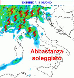 Sabato 13 e domenica 14 giugno tempo instabile al nord e in parte anche sulla Toscana con possibili temporali localmente forti e temperature in calo. Su tutte le altre regioni tempo abbastanza buono e caldo. Lunedì 15 giugno ancora nubi irregolari al nord con qualche precipitazione, più sole a meridione e sulle Isole. Martedì 16 e mercoledì 17 giugno tempo instabile al centro-nord e sulla Campania, con temporali sparsi e calo delle temperature, giovedì 18 giugno migliora temporaneamente, mentre nuova recrudescenza instabile sull’Italia per venerdì 19 giugno.
