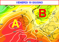 Nella giornata di venerdì 19 giugno (terza cartina a lato), l’estate farà una migrazione sulle Isole Britanniche. L’Europa centrale e la nostra Penisola si troveranno quindi scoperte e soggette ad ingerenze instabili e fresche dai quadranti settentrionali. In altre parole, l’estate stenterà ancora ad imporsi con decisione sullo Stivale.