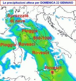 Domenica 22 gennaio: peggiora su buona parte dell’Italia con piogge e rovesci sparsi specie al centro-sud, qualche nevicata a bassa quota al nord-ovest, asciutto al nord-est.
