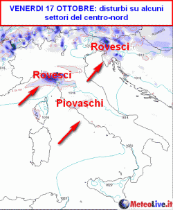 Giovedi 16 e venerdì 17 ottobre: correnti da sud-ovest sull’Italia con possibili piogge, localmente a carattere di rovescio tra il Levante Ligure e l’alta Toscana, con particolare riferimento alla zona delle Alpi Apuane. Qualche rovescio sarà possibile anche sul Friuli e nelle zone interne del Lazio, per il resto nubi sparse e assenza di fenomeni in un contesto molto mite.