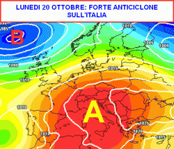 L’alta pressione uscirà allo scoperto e si manifesterà sull’Italia in tutto il suo splendore ad iniziare dalla giornata di domenica 19 ottobre. La seconda cartina inquadra la situazione sinottica attesa per lunedì 20 ottobre.