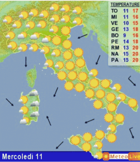 Tra giovedi 12 e venerdi 13 novembre: aumento della nuvolosità sul Tirreno e sulla Liguria con qualche piovasco specie sull’alto Tirreno. Altrove situazione invariata, ma con maggiori addensamenti senza fenomeni. Clima sempre mite.