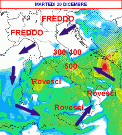 La giornata più perturbata per il centro e il sud sarà martedì 20 dicembre (seconda mappa).