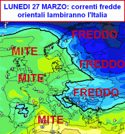 Lunedì 27 marzo (prima mappa) parte di questa aria fredda dilagherà in Italia; oltre ad una generale (e temporanea) diminuzione della temperatura, attiverà rovesci al sud e in Abruzzo, anche nevosi in Appennino sopra gli 800-1000 metri.