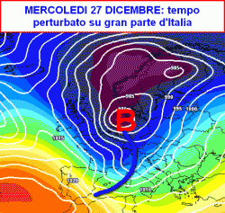 Il primo corpo nuvoloso sarà seguito a stretto giro da un secondo elemento perturbato che interesserà l’Italia nella giornata di mercoledi 27 dicembre (seconda mappa).