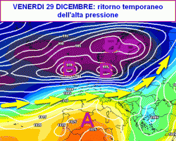 La terza mappa valida per venerdì 29 dicembre mostra la suddetta flebile rimonta dall’alta pressione che garantirà una breve fase di stabilità in Italia con temperature abbastanza miti.
