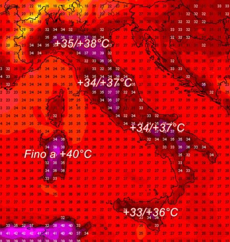 Nella seconda metà della settimana i valori termici potranno di nuovo toccare la soglia dei +35/+37°C su isole maggiori, Puglia, Basilicata, Calabria. Picchi fino a +32/35°C saranno possibili anche al centro e al nord. Picco di caldo nel weekend, dove potrebbero tornare a farsi vedere alcuni picchi di +40°C. Una primissima stima delle temperature MASSIME previste dal modello americano per sabato 24 luglio: