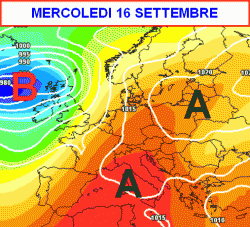 La terza cartina, valida per mercoledì 16 settembre ci mostra una situazione di generale bel tempo in Italia; le temperature non faranno rimpiangere l’estate appena terminata e si riporteranno su valori superiori alle medie del periodo.