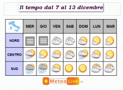 mercoledì 7 dicembre: al nord bel tempo ma nebbie in pianura, sulla Sardegna orientale e meridionale instabile con rovesci o temporali, sul resto del centro schiarite sul Tirreno, nebbia sulle Marche, nubi basse in Abruzzo con sporadiche piogge in attenuazione, al sud nuvolosità irregolare con fenomeni concentrati su est Sicilia e regioni joniche, anche di forte intensità. Freddo sotto la nebbia e nelle vallate alpine, mite in alta quota e sulle coste.