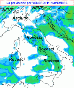 RIASSUMENDO: giovedì 10 novembre ultime piogge al sud in via di attenuazione, neve in arrivo sui settori alpini confinali, per il resto bel tempo. Venerdì 11 novembre instabile o perturbato al centro e al sud con piogge sparse e rovesci, neve sulle Alpi di confine, asciutto e in parte soleggiato al nord. Sabato 12 novembre abbastanza buono ovunque, mentre tra domenica 13 e lunedì 14 novembre nuovo passaggio perturbato sull’Italia con piogge sparse e neve sulle Alpi. A seguire situazione in miglioramento e generale rialzo delle temperature.