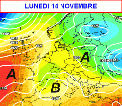 Tra domenica e13 e lunedi 14 novembre si farà sotto una nuova perturbazione, associata ad un minimo barico in prossimità della Sardegna (seconda mappa).