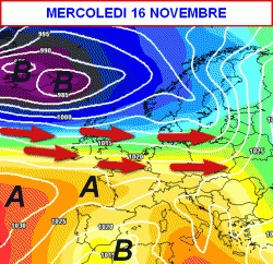 A seguire, la ripresa del getto sulla media Europa farà sprofondare la depressione verso il nord Africa e darà adito all’alta pressione di allungarsi verso la nostra Penisola tra martedì 15 e mercoledì 16 novembre (terza mappa).
