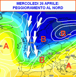 Il tempo potrebbe cambiare in maniera decisa al nord nella giornata di mercoledì 26 aprile (seconda mappa).