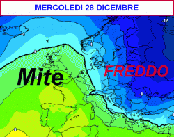 Mercoledì 28 dicembre probabile peggioramento sulle regioni adriatiche e al sud con temperature in calo, invariato altrove.